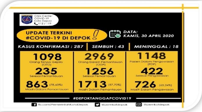 Tim Gugus Tugas Percepatan Penanggulangan Covid 19 Kota Depok merilis jumlah pasien positif corona. Dimana, data terbaru per 30 April 2020 kasus konfirmasi sebanyak 287, sembuh 43 dan meninggal 18 orang.