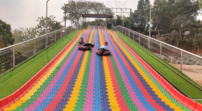 Kini warga Depok tak perlu jauh-jauh lagi untuk berlibur hanya untuk mencoba wisata alam yang ada wahana bermainnya seperti perosotan pelangi (rainbow slide).