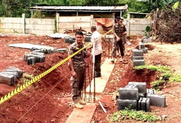 Jajaran personel Bantuan Kendali Operasi (BKO) Satpol PP wilayah Kecamatan Limo, Kamis (09/04/26) melakukan pemasangan police line lokasi pembangunan gelanggang olah raga (GOR) Padel di Jalan Bukit Tambora Rt 02/05, Kelurahan / Kecamatan Limo.